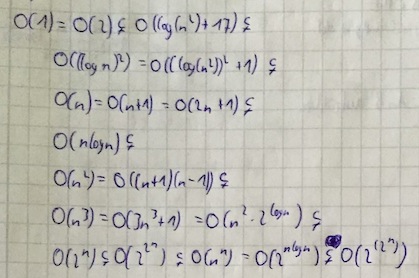 Ordnen Sie folgende Mengen von Funktionen bezüglich Inklusion und stellen Sie Gleichheiten fest! Dabei steht log für den abgerundeten Logarithmus zur Basis 2 mit log(0) =def 0. Eine Begründung der Inklusionen und Gleichheiten ist hier nicht gefordert.